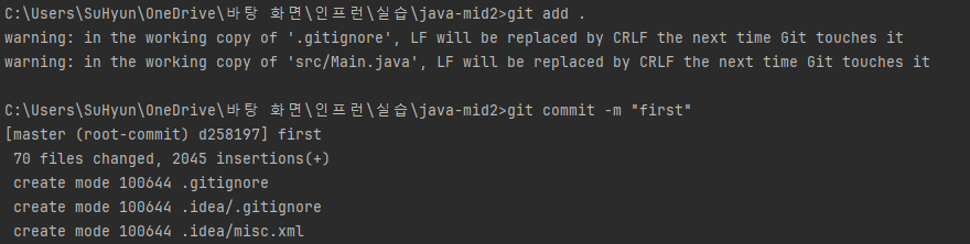 2. 현재 작업하고 있는 위치로 이동하여 git add와 git commit을 이용하여 저장합니다.