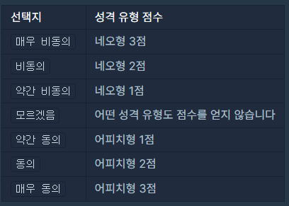 이때 검사자가 질문에서 약간 동의 선택지를 선택할 경우 어피치형(A) 성격 유형 1점을 받게 됩니다. 만약 검사자가 매우 비동의 선택지를 선택할 경우 네오형(N) 성격 유형 3점을 받게 됩니다.