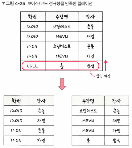 보이스/코드 정규형(BCNF)은 제3 정규형이고, 결정자가 후보키가 아닌 함수 종속 관계를 제거하여 릴레이션의 함수 종속 관계에서 모든 결정자가 후보키인 상태를 말합니다.