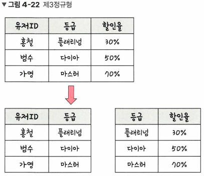 예를 들어 쇼핑몰이 있다고 했을 때 유저 ID와 등급, 할인율이 정해져 있는 테이블을 다음과 같이 분해하는 것을 말합니다.
