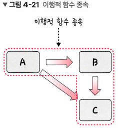 이행적 함수 종속이란 A -> B와 B -> C가 존재하면 논리적으로 A -> C가 성립하는데, 이 때 집합 C가 집합 A에 이행적으로 함수 종속이 되었다고 합니다.